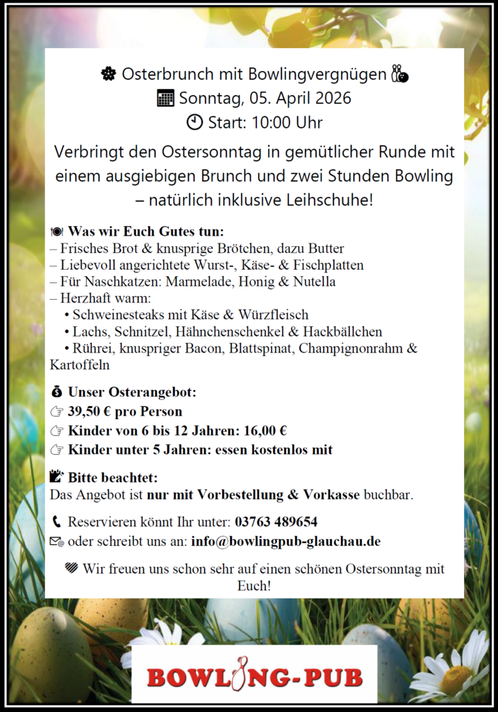 Auf einen Blick: Öffnungszeiten: Montag, Donnerstag und Sonntag von 15-22 Uhr Freitag und Samstag von 15-24 Uhr Dienstag und Mittwoch sind Ruhetage Telefon: 03763 / 48 96 54 Adresse: Güterbahnhofstraße 6 08371 Glauchau Bowlingbahnen: Montag / Bowlingtag 10,80 € / Stunde Donnerstag 16,80 € / Stunde Freitag / Samstag 25,20 € / Stunde Bowlingschuhe 1,80 € Vorfeiertag / Feiertag 25,20 € / Stunde Sonntag / Familientag 21,00 € / Stunde